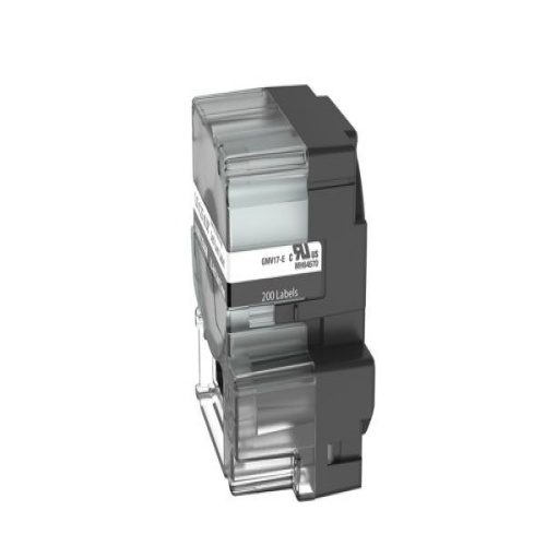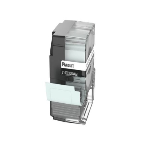 The S100X125VAM Die-Cut Self-Laminating Label Cassette includes both label material and ribbon for easy changeover. Self-laminating adhesive labels for wire/cable identification include a white print-on area and a clear overlaminate. For use with the MP300 printer. Vinyl. 1" x 1.25" (25.4 mm x 31.8 mm). Wire/Cable Size Range 12 - 10 AWG. Color Clear/White. 200 labels per cassette. 1 cassette per package.