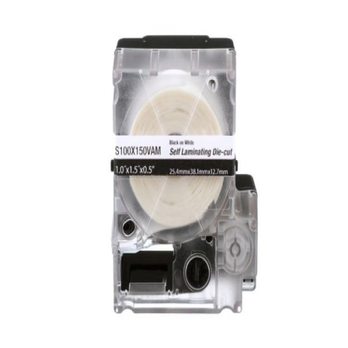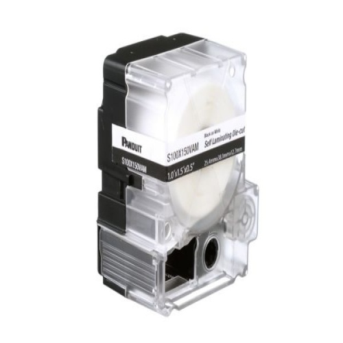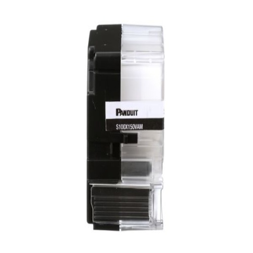 Panduit S100X150VAM vinyl self-laminating label cassettes, can easily be installed on existing terminated wires and assemblies and does not require disconnecting wires or cables. Upgrade your cable coding system with improved organization and identification. Adhesive labels for wire/cable identification with white print-on area and clear overlaminate. Label is 1.0" x 1.5", with 1.0" x 0.5" print-on area. For use with Panduit MP series printers and designed for cat. 5/5e/6 cable. 175 labels per cassette.