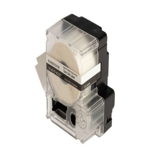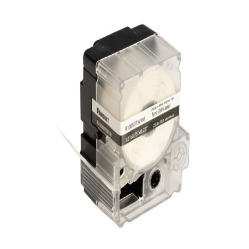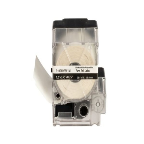 The R100X075V1M Self-Laminating Turn-Tell Label Cassette includes both label material and ribbon for easy changeover. The label design allows rotation for visibility from any angle - reposition on the wire/cable to align legends and improve aesthetics. Can be easily installed on existing terminated wires and assemblies without disconnecting the wires/cables. For use with the MP300 printer. Vinyl. 1" x 0.75" (25.4 mm x 19.1 mm). Color Clear/White. 175 labels per cassette. 1 cassette per package.