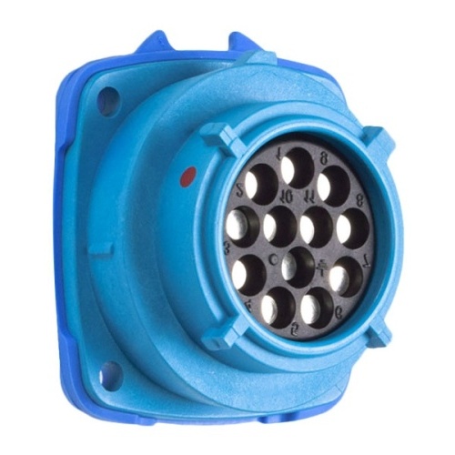 Meltric 03-A4001-001-NC PN12c INLET POLY BLUE SIZE 1 TYPE 4X IP 69 11P+G 15 A 480 VAC/ VDC 60 Hz REVERSE INTERIORS SELF-RETURNING LID