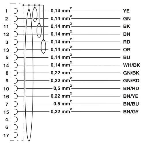 Phoenix Contact K-17 - Cable plug in molded plastic, M17-Socket, Straight, plastic molded, number of positions: 17, type of locking: Screw locking mechanism, cable length: 2 m, shielded: yes, color of outer sheath: green, Alternative product in accordance with RoHS II without Exemption 6c (Pb < 0.1 %) item no.: 1261279 - 1624780