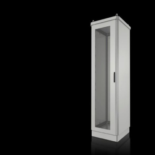 Outdoor enclosure with 100 mm transport plinth and rain canopy with projections on all sides. Side panels, rear panel and door fully double-walled on the outside, the entire TS 8 frame is available for interior installation.