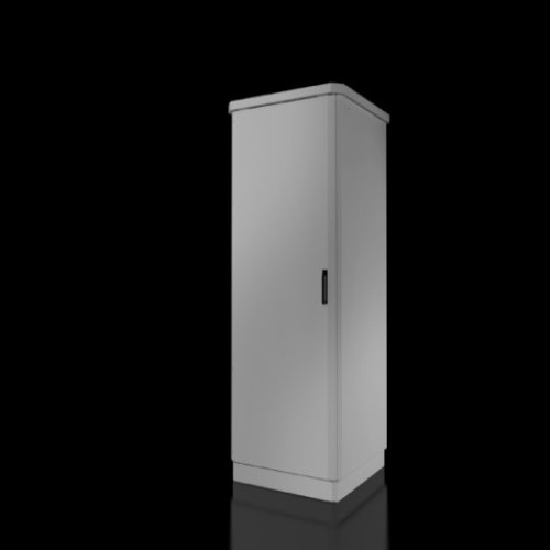Outdoor enclosure with 100 mm transport plinth and rain canopy with projections on all sides. Side panels, rear panel and door fully double-walled on the outside, the entire TS 8 frame is available for interior installation.