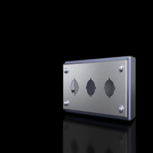 Enclosure solution with cut-outs for switches, tailored to the requirements of the food and beverage industry. All-round gap-free silicone seal between enclosure and cover. Hygiene-compliant quick-release hexagon fastener.