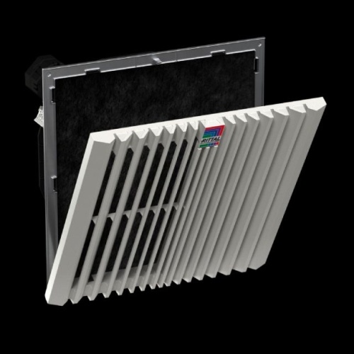 Benefits: Easy filter changes, thanks to a new opening mechanism on the louvred grille Faster installation on the enclosure with optimised detent hooks Diagonal fan technology achieves more even and constant ventilation of the enclosure, thanks to improved pressure stability Tool-free assembly