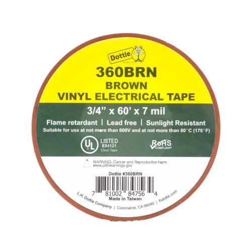 Dottie 360BRN - 3/4'' x 60' Brown Electrical Tape is a PVC color coding tape designed for marking, identifying, insulating, and wire harnessing. With flame-retardant properties and strong tensile strength (7 KG/in), it is ideal for use on high voltage splices. Cello wrapped for convenience. Suitable for wires, connectors, and electrical appliances. Performs well in all climates.