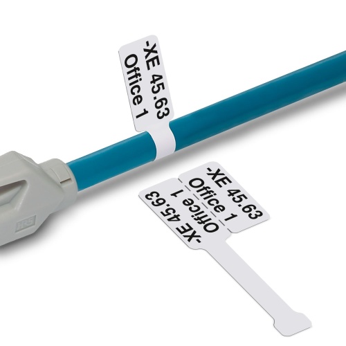 Phoenix Contact 0830712 Cable marking flags made of white roll can be labeled with various Thermomark products including the THERMOMARK E.300 (D)/600 (D), ROLL 2.0, ROLL, ROLL X1, ROLLMASTER 300/600, and X1.2 labels. These labels have an adhesive mounting type, a maximum cable diameter of 6 mm, can accommodate up to 2500 individual labels per flag, and feature text fields with a height of 10 mm and width of 30 mm.