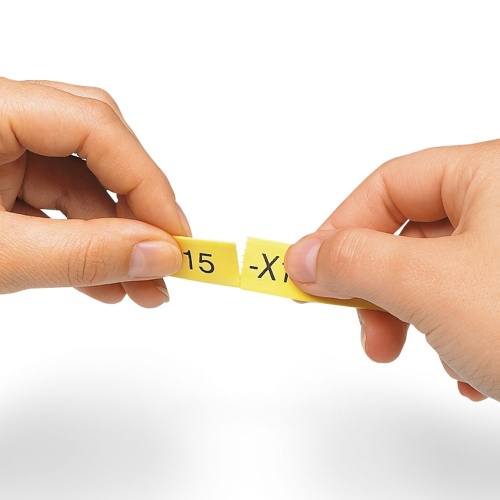 Phoenix Contact 0800328 A shrink sleeve can be labeled with various THERMOMARK products including RollMaster 300/600, Roll X1, Roll 2.0, W and X1.2, among others. The sleeve's specifications include a yellow color, no labeling initially, and a cable diameter range of 0.8 to 2.4 mm in an unperforated mounting type that slides onto the product. The automated processing allows for a smaller cable diameter range of 0.8 to 1.5 mm, with the option to apply one individual label per unit. The roll length is 120 meters and has text fields measuring 4mm in height and 120,000mm in width.