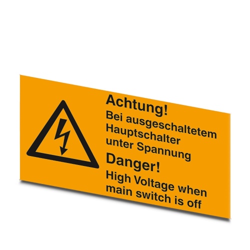Phoenix Contact 0830461 A warning label with a lightning flash symbol is available in both yellow and black colours, featuring warnings in German and English. The label has an adhesive mounting type and is designed to be mounted on a sheet of material with a diameter of 0mm. Four individual labels are included and the text field height measures 26mm while the width measures 52mm.