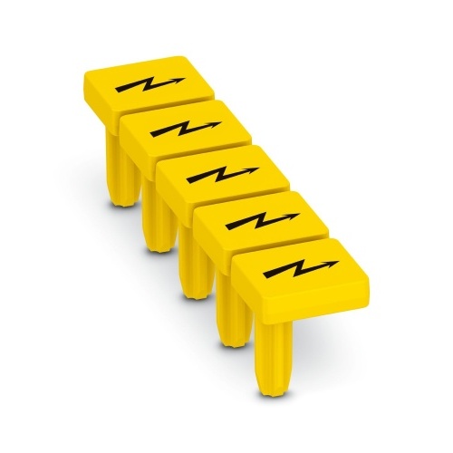 Phoenix Contact 1029563 A warning label featuring a lightning flash design with a black background and yellow highlights is attached to a 5-section device, indicating its mounting method as a plug-in connection that accommodates terminals with a width of 6.2 millimeters.