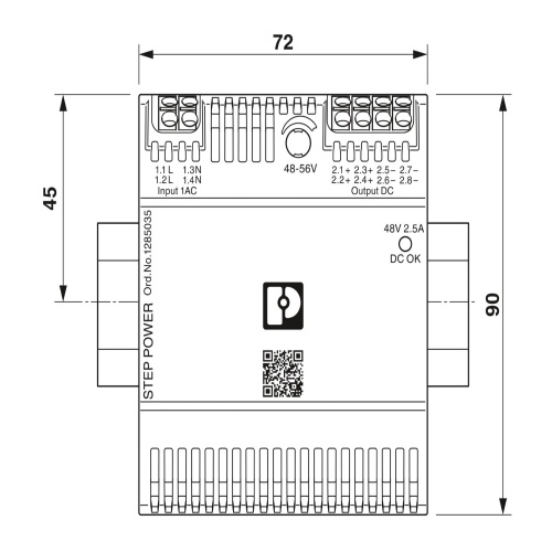 Phoenix Contact 1285035 The STEP POWER power supply unit is a primary-switched design that can be easily installed via a push-in connection or mounted directly to a DIN rail. It accepts a single-phase input and provides an output of 48V DC at 2.5A, which can be adjusted up to 56V DC. Additionally, it supports Power over Ethernet (PoE) applications with a maximum power delivery of up to 120W.