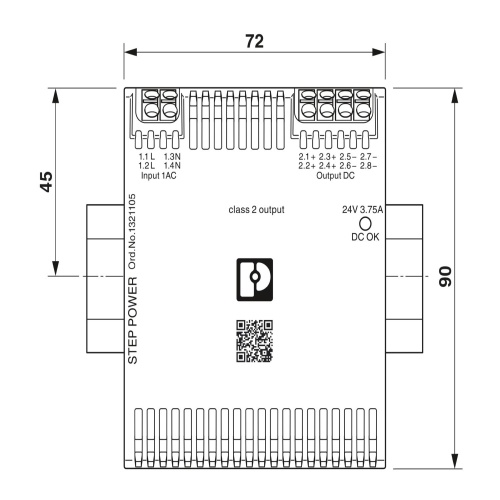 Phoenix Contact 1321105 The STEP POWER is a primary-switched power supply unit that can be easily mounted using either a push-in connection on the DIN rail or direct mounting. It comes equipped with a protective coating and has an input capacity of 1-phase, while delivering a stable output voltage of 24 V DC at a maximum current rating of 3.75 A.