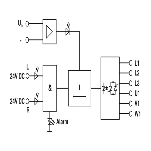 Phoenix Contact 2964186 The electronic reversing load relay is designed to power equipment directly within a 3-phase network and features an accompanying light indicator and built-in protection circuitry, providing an output of 110-550 V AC at a maximum current capacity of 3 x 9 A.