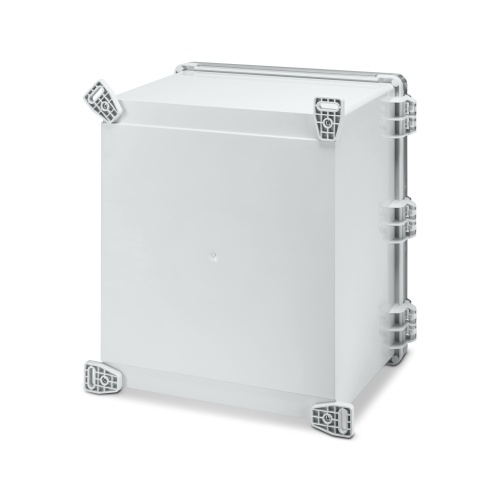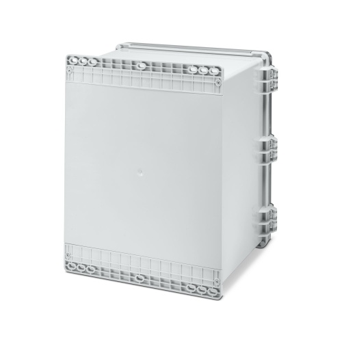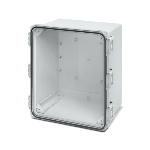 Phoenix Contact 1557797 The outdoor housing has a light gray color and measures 482 x 463 x 286mm (18" x 16" x 10") including corner inlays, cover plugs, and screws. The cover is made of transparent, UV-stabilized polycarbonate material with a plastic latch to secure it in place.