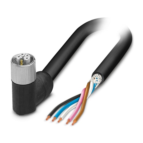 Phoenix Contact 1291271 A 5-position power cable made from PVC with a black finish and advanced shielding technology is available. The cable has a free end and features an angled M12 socket for secure connection. It comes in a standard configuration with a coding of "L" and measures 5 meters in length.
