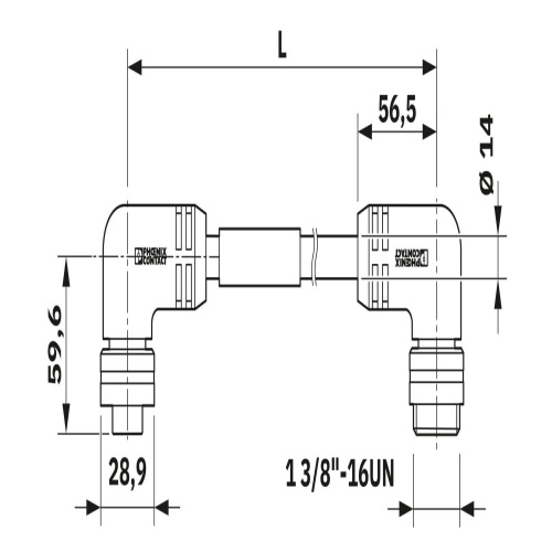 Phoenix Contact 1423274 A power cable featuring a 4-position design, made from thermoplastic elastomer (TPE) in black, comes with an angled plug and socket both measuring 1-3/8" - 16UN, each bearing standard coding, and is 1 meter in length.