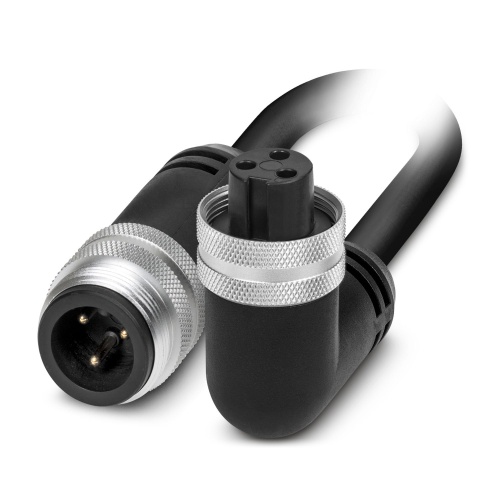 Phoenix Contact 1423200 The power cable is a three-position, thermoplastic elastomer (TPE) component with a black color, featuring a plug with a straight 1-3/8"-16UN thread and an angled socket with the same thread size. The cable has a standard coding and measures 1 meter in length.