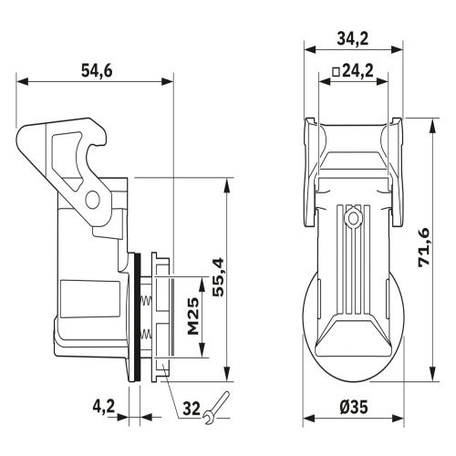 Phoenix Contact 1672260 The screw-in housing features a single locking latch and is made from die-cast aluminum, making it resistant to corrosion in saltwater environments. It has a height of 38.5mm and comes with a standard seal, which is angled for better sealing performance.