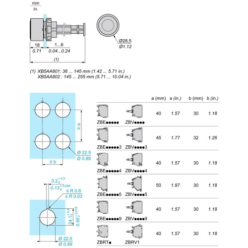 Schneider XB5AA86202 Manual overload reset push-button 4.72-10.12 in (120-257 mm Dark gray plastic Round Blue flush, R white Harmony XB5 Standard XB5 Plastic 0.87 in (22 mm 1.14 in (29 mm 1.14 in (29 mm 10.12 in (257 mm 0.09 lb(US (0.04 kg 1015.26 psi (7000000 Pa 131 °F (55 °C 0.
