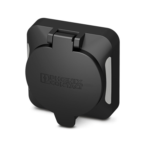 Phoenix Contact 1549875 The CHARX product is a modular type 2 protective cover designed with a premium finish and features a square shape that can be mounted on front with an M5 thread and self-locking mechanism, suitable for attaching to infrastructure charging sockets, distinguished by the presence of a visible LED light connection and an embossed Phoenix Contact CONTACT logo, meeting the standards set by IEC 62196-2.