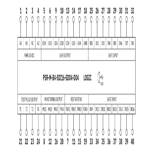 Phoenix Contact 1738576 A configurable safety module with a basic configuration includes 16 safe inputs, 4 safe outputs, 4 reset inputs, 4 signal outputs, 4 clock outputs and is compatible with SIL levels up to 3, Category 4/PL e, utilizing a plug-in screw terminal block.