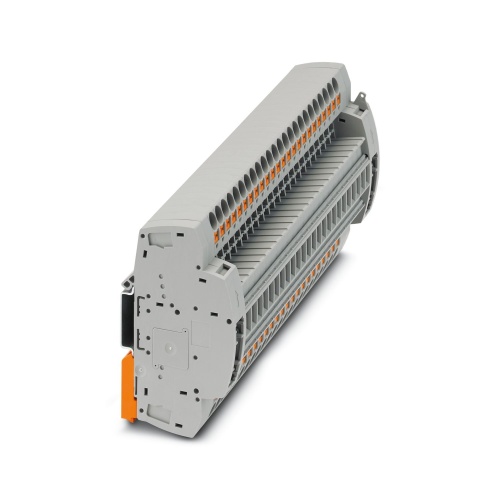 Phoenix Contact 3069873 The test terminal strip features a nominal voltage of 400V and has 48 connections, arranged in 24 positions, with a push-in connection method, allowing for varying cross-sectional ratings from 0.5mm² to 10mm², mounted on a DIN rail in a gray color scheme.
