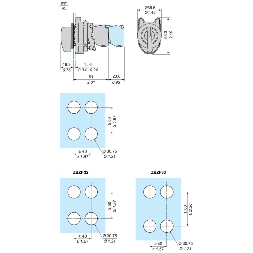 Schneider ZB4FJ2 stay put Head for selector switch 2 positions 90° Chromium plated metal Round Black long handle 1 Harmony XB4 Built-in-flush ZB4F 1.20 in (30.5 mm 0.17 lb(US (0.078 kg 1015.26 psi (7000000 Pa 131 °F (55 °C 0.1 m 1000000 cycles Basic element TH -40-158 °F (-40-70