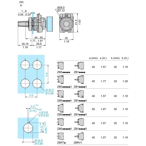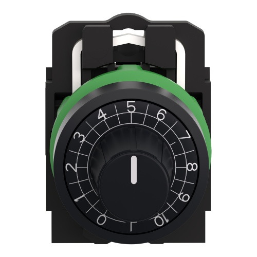 Schneider ZB5AD922 Head + mounting base for potentiometer For use with Ø 6.35 mm shaft Dark gray plastic Round knurled knob, with white 1 Harmony XB5 Standard ZB5 0.87 in (22 mm 0.07 lb(US (0.032 kg 1015.26 psi (7000000 Pa 131 °F (55 °C 0.1 m Basic element TH -40-158 °F (-40-70 °