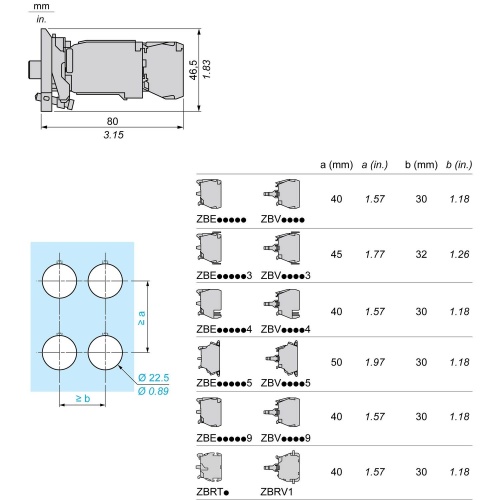 Schneider ZB4BW045 220-240 V AC 50/60 Hz Complete body/contact assembly and Light Module 1 NO + 1 NC Incandescent BA 9s Standard Steady 1 Harmony XB4 Standard 10 A EN/IEC 60947-5-1 1000000 cycles, AC-15, 2 A 230 V 3600 cyc/h 0.5 EN/IEC 60947-5-1 appendix C, 1000000 cycles, AC-15,