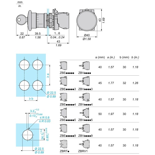 Schneider XB5AS9445 trigger action and mechanical latching Emergency stop push-button, Emergency switching off push-button 1 NO + 1 NC Key release Dark gray plastic Ronis 455 Center Round Red mushroom Ø 40 mm, unmarked Standard contacts 1 Harmony XB5 Standard 10 A EN/IEC 60947-5-