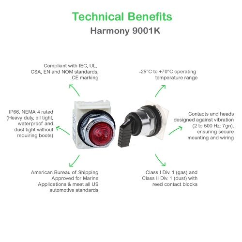 The 9001K and 9001SK 30mm push button operators conforms to IEC, UL, CSA, EN and NOM standards