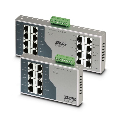 Phoenix Contact 2832849 A 16-port Ethernet switch features built-in auto-detection for determining the optimal data transmission speed between 10 and 100 megabits per second using RJ45 connectors, along with an automatic crossover function.