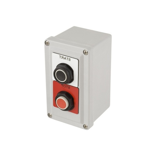 This assembled control station has polymeric (plastic) enclosure (9001SKY2) with two push button operators