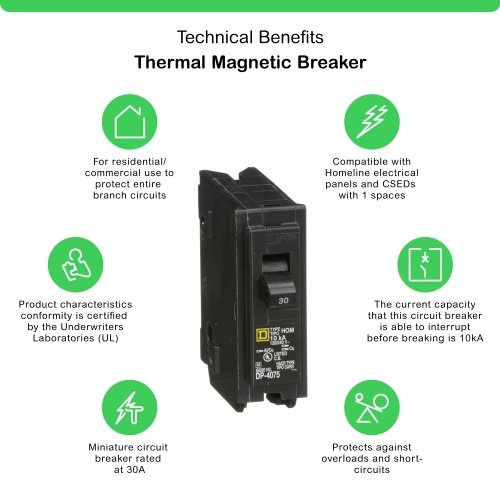 Schneider HOM130 30 A 120/240 VAC 1P HACR rated Clamp terminal for 2 cables Plug-in Miniature circuit-breaker Homeline 00046 - HOM/T 15-30A 1P; 15-60A 2P Miniature Circuit Breakers Square D™ Homeline™ Miniature Circuit Breakers Homeline Plug-on Circuit Breakers (MUST BUY IN PACKS OF 10)