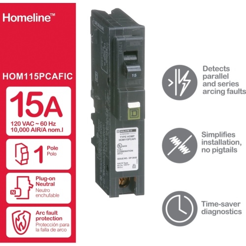 Schneider HOM115PCAFI 15 A 120 VAC 1P HACR rated Screw clamp terminals Plug-in Miniature circuit-breaker Homeline 06301 - HOM SINGLE POLE ARC FAULT CIRCUIT BREAKER Square D™ Homeline™ Miniature Circuit Breakers (CAFI) Combo Arc Fault Breakers Plug-on Neutral