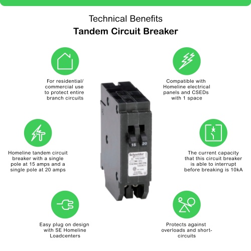 Schneider HOMT1520 20 A, 15 A 120/240 VAC 1P HACR rated Box lugs Plug-in Miniature circuit-breaker Homeline 00046 - HOM/T 15-30A 1P; 15-60A 2P Miniature Circuit Breakers Square D™ Homeline™ Miniature Circuit Breakers (HOMT) Tandem Breakers (MUST BUY IN PACKS OF 10)
