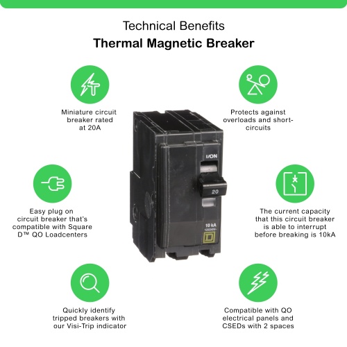 Schneider QO220 20 A 120/240 VAC, 120 VAC, 48 VDC 2P HACR rated Pressure plate Plug-in Miniature circuit-breaker 104 °F (40 °C 10 kA 120/240 VAC 50/60 Hz, 10 kA 120 VAC 50/60 Hz, 5 kA 48 VDC QO 00004 - QO,QOT 10-30A 1P;10-60A 2P Miniature Circuit Breakers Squ (MUST BUY IN PACKS OF 5)