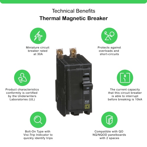 Schneider QOB230 30 A 120/240 VAC, 120 VAC, 48 VDC 2P HACR rated Pressure plate Bolt-on Miniature circuit-breaker 104 °F (40 °C 10 kA 120/240 VAC 50/60 Hz, 10 kA 120 VAC 50/60 Hz, 5 kA 48 VDC QO 00015 - QOB CIRCUIT BREAKERS Miniature Circuit Breakers Square D™ QO™ and QOB Miniatu (MUST BUY IN PACKS OF 5)