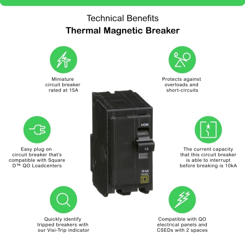 Schneider QO215 15 A 120/240 VAC, 120 VAC, 48 VDC 2P HACR rated Pressure plate Plug-in Miniature circuit-breaker 104 °F (40 °C 10 kA 120/240 VAC 50/60 Hz, 10 kA 120 VAC 50/60 Hz, 5 kA 48 VDC QO 00004 - QO,QOT 10-30A 1P;10-60A 2P Miniature Circuit Breakers Squ (MUST BUY IN PACKS OF 5)