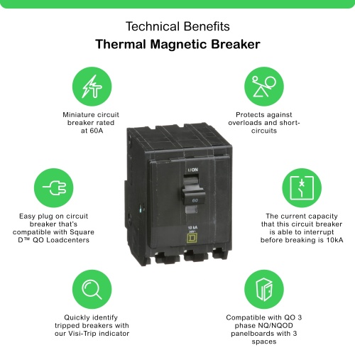 Schneider QO360 60 A 120/240 VAC, 240 VAC, 120 VAC, 48 VDC 3P HACR rated Box lugs Plug-in Miniature circuit-breaker 104 °F (40 °C 10 kA 120/240 VAC 50/60 Hz, 10 kA 240 VAC 50/60 Hz, 10 kA 120 VAC 50/60 Hz, 5 kA 48 VDC QO 00012 - QO 3 POLE CIRCUIT BREAKER Mini (MUST BUY IN PACKS OF 3)
