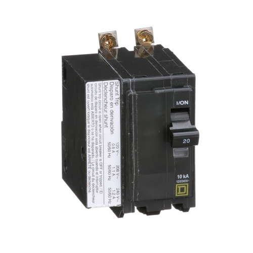 Schneider Electric QOB2201021 Mini circuit breaker, QO, 20A, 2 pole, 120/240 VAC, 10 kA, bolt on mount, AC shunt trip