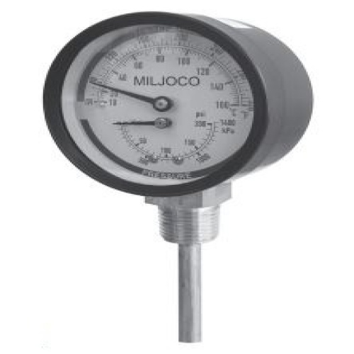 The Miljoco Models PB3008L & PB3008 dual indicating pressure/temperature gauges, or commonly referred to as “tridicators”, combine the value of an individual pressure gauge and thermometer in one instrument