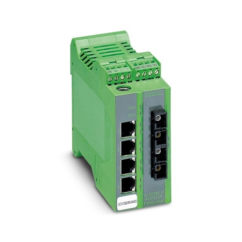 Phoenix Contact 2891916 This network switch features four ports that support fast data transfer at speeds of up to 100 Mbps via traditional twisted-pair cables, as well as two more ports designed for longer-distance connections using single-mode fiber cables.