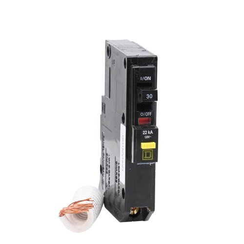 Mini circuit breaker, QO, 30A, 1 pole, 120 VAC, 22 kA, 6mA grd fault A, pigtail, plug in mount