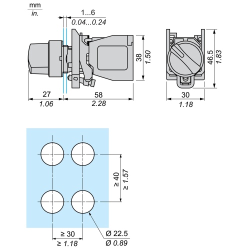 Schneider XB4BD53GEX Complete selector switch Black standard handle 2 NO To centre spring return 3 positions +/- 45° Screw clamp terminals, 2 x 1.5 mm² with cable end EN/IEC 60947-1, Screw clamp terminals, 1 x 2.5 mm² without cable end EN/IEC 60947-1 Zamak Chromium plated metal 0