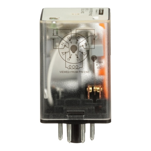 Schneider Electric 8501KPDR12P14V53 Plug in relay, Type KP, tubular, 1 HP at 277 VAC, 10A resistive at 120 VAC, 8 pin, DPDT, 2 NO, 2 NC, 24 VDC coil, light