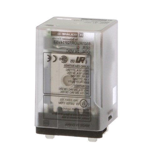 Schneider Electric 8501KUDR12P14V53 Plug in relay, Type KU, blade, 0.5 HP at 240 VAC, 10A resistive at 120 VAC, 8 blade, DPDT, 2 NO, 2 NC, 24 VDC coil