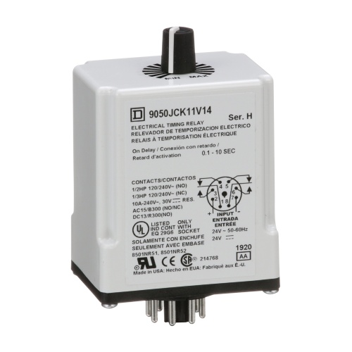Schneider Electric 9050JCK11V14 Timing Relay, Type JCK, plug In, on delay, adjustable time, 0.1 to 10 seconds, 10A, 240 VAC, 24 VAC/DC