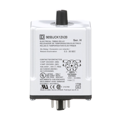 Schneider Electric 9050JCK12V20 Timing Relay, Type JCK, plug In, on delay, adjustable time, 0.3 to 30 seconds, 10A, 240 VAC, 120 VAC/110 VDC