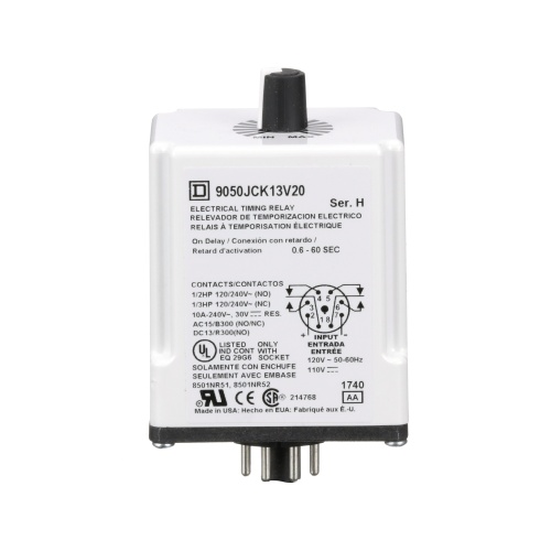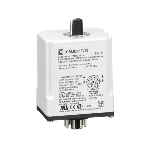 Schneider Electric 9050JCK13V20 Timing Relay, Type JCK, plug In, on delay, adjustable time, 0.6 to 60 seconds, 10A, 240 VAC, 120 VAC/110 VDC